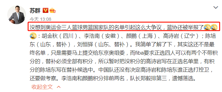 “没想到奥运会三人篮球男篮国家队的名单引起这么大争议,篮协还被举报了。胡金秋(四川)、李浩南(安徽)、颜鹏(上海)、高诗岩(辽宁);陈培东(山东,替补),刘恒驿(山东、替补)”。