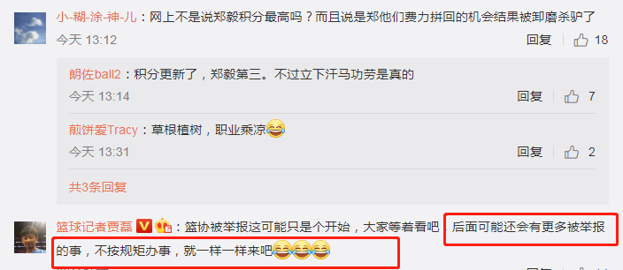 而国内篮球记者贾磊也在社媒上给苏群留言,“篮协被举报可能只是个开始,大家等着看吧,后面可能还会有更多被举报的事,不按规矩办事,就一样一样来吧”。