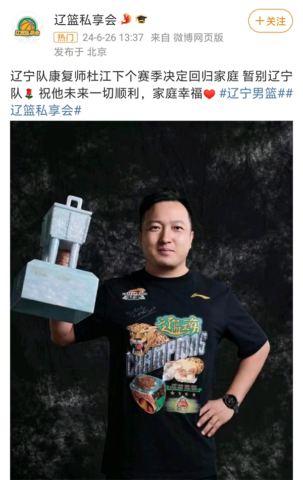 而在这个休赛期,辽篮球迷最期待的莫过于球队能够把所有夺冠的功臣全部留下,然后再加上补强,不过这显然是不现实的,天下无不散之筵席,有的时候离开是为了更好的重聚,当球迷还在担心韩德君、李晓旭会不会退役,弗格、莫兰德还会不会回来的时候,辽篮男篮三连冠的功臣,离队的第1人曝光,那就是康复师——杜江。