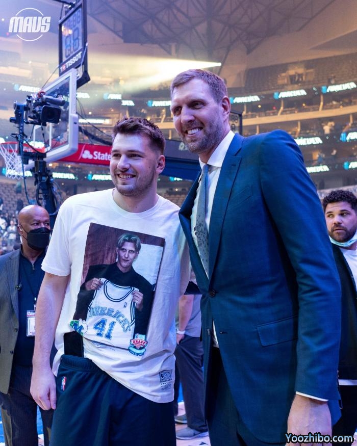 独行侠老板库班、主帅基德、总经理尼克-哈里森、篮球运营副总裁芬利以及东契奇都来到现场,东契奇身穿向诺天王致敬的T恤,在现场与诺维斯基开心合影,独行侠官方晒合影并写道:大山羊和小山羊(goat代指历史最佳)。