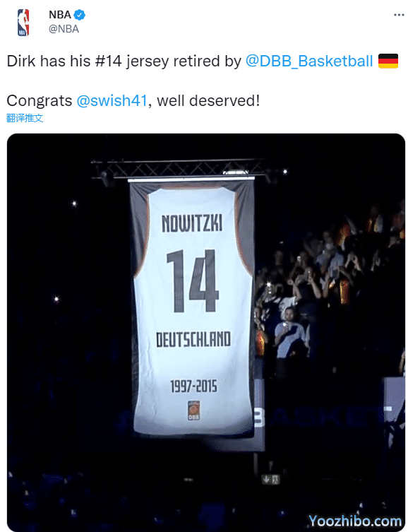 NBA官方祝贺诺天王:德克的14号球衣被德国篮联正式退役,恭喜德克,你当之无愧!独行侠官方晒出诺维斯基球衣退役的现场画面,还配文写道:诺维斯基获得德国篮联史上最大荣誉,历史第一位被德国队退役球衣的德国球员,恭喜历史最佳,各方面都是独一无二的。