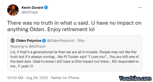 波利尼斯在社媒上回复杜兰特:“哈哈,如果那是世纪谎言的话,那我们都有麻烦了。人们可能不喜欢真相,但事实却是如此。就像PJ-塔克对你说‘我爱你’一样,你仍然是历史最佳之一。很高兴知道我说的话仍然有一点影响力,我去!KD回复我了!”