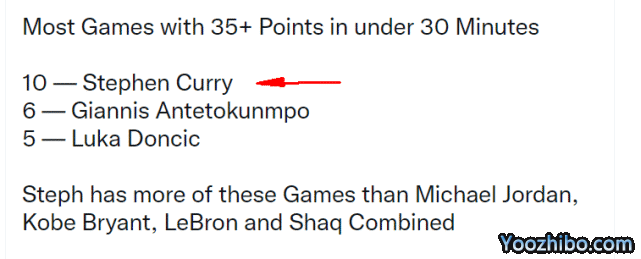 其二,库里在30分钟以内单场得分35+的场数,一共有10场,同样是历史上最多的。排名第二的是字母哥(6场),第三是东契奇(5场)。众所皆知,库里常常“三节打卡”就能拿下高分,美媒指出,他达成这项成就的次数超过了乔丹、科比、詹姆斯和奥尼尔这四位巨星的总和。