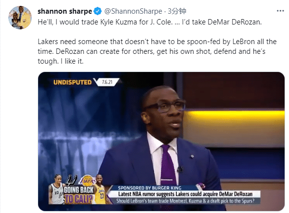 香农-夏普同意把库兹马交易出去,他表示:我愿意用库兹马换J Cole(说唱歌手,此前和湖人助教一起训练),我更要用他交易德罗赞,湖人不需要一位一直被詹姆斯喂饼的人,德罗赞可以自己创造进攻,防守以及他很坚强。