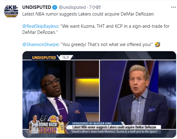 “著名詹黑”斯基普-贝勒斯谈到湖人引援德罗赞的交易流言,他表示:湖人可以用库兹马、霍顿-塔克和波普以先签后换的方式交易来德罗赞;对此香农-夏普回应:你这个贪婪的家伙,湖人是不可能给这么多筹码的。