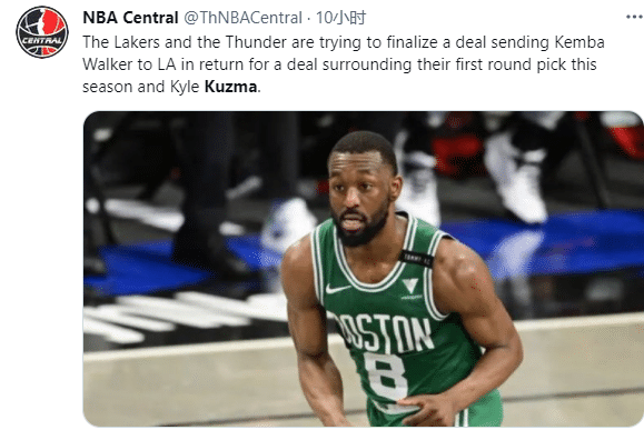 美媒NBA Central爆料,湖人正试图和雷霆敲定一笔交易从而引援肯巴-沃克,湖人所提供的筹码是库兹马和今年首轮选秀权;此前凯尔特人把沃克交易到雷霆,雷霆愿意把沃克送到他想去的球队。