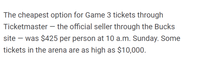 这只是球馆内的最低价格,要想坐在更好的位置上看球,就得多掏腰包了。密尔沃基媒体报道称,雄鹿主场G3的一些球票价格已经涨到10000美元左右。