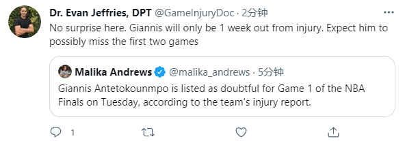 究竟字母哥何时才能重返赛场?据医学专家Evan Jeffries分析,字母哥受伤后才过一周,他将缺席总决赛G1,治疗时间可能会因伤病的不同发生变化,但字母哥至少需要两周才能更接近复出,预计他将缺席总决赛前两场比赛。