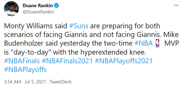 来源:360直播07-05 11:27360直播讯 雄鹿和太阳将在7月7日打响总决赛首战,而太阳主帅蒙蒂-威廉姆斯告诉记者,球队正在准备两套方案:一套是对阵拥有字母哥的雄鹿,而另一套是对阵没有字母哥的雄鹿。就在一天前,雄鹿主帅布登霍尔泽表示,字母哥目前的膝盖状态是每日观察,而外界普遍认为,字母哥有希望在第一场总决赛就回归。字母哥打不打还没最终敲定,蒙蒂计划做好两手准备。