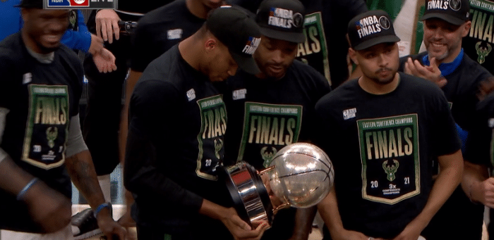 东部冠军颁奖仪式!字母哥主动要抱奖杯,米神第一个捧杯+抱奖杯离场
