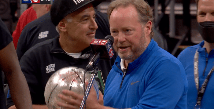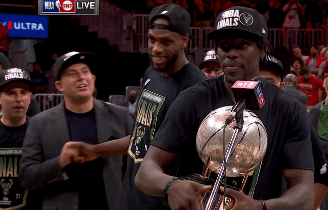 赢得东部冠军后,字母哥冲上球场,紧紧拥抱米德尔顿,然后拥抱其他队友;在 东部冠军颁奖典礼上,米德尔顿第一个捧起东部冠军奖杯,全队为他鼓掌欢呼,然后米神举起奖杯,其他队友都围过来,一起摸着奖杯再次狂欢庆祝。