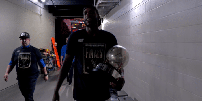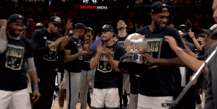 雄鹿众球员合影之后,最终米德尔顿抱着东部冠军奖杯走回更衣室,开心之情溢于言表。