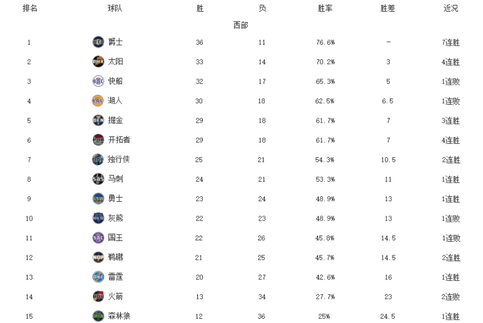 爵士今天击败了灰熊,他们这一波7连胜从此前的低迷中走了出来,战绩联盟第一。太阳今天击败公牛,迎来4连胜,布克轰下45分,表现抢眼。快船昨天领先16分的情况下被魔术逆转,爆出冷门,莱昂纳德的失误和浪投很致命。湖人今天对阵雄鹿,庄神德拉蒙德迎来首秀,詹眉依旧缺席,他们遗憾的输了球,庄神还因为脚趾的伤势下场。掘金近期在约基奇的带领下表现也很强势,他们已经取得了一波3连胜。开拓者今天大胜活塞,豪取4连胜,已经逐渐逼近前四。独行侠今天击败凯尔特人,他们依旧有希望直通季后赛。马刺今天击败了西部的国王,波波维奇的球队本赛季的发挥还是很不错的。