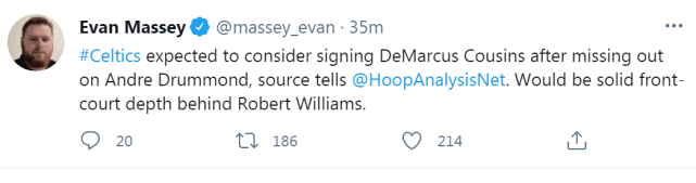 昔日的全明星,如今已经沦为备胎。此前有报道称,湖人也对考辛斯有兴趣,但他们的头号目标是德拉蒙德,只有签不下德拉蒙德才会考虑签考辛斯,如今,凯尔特人也是一样的想法。