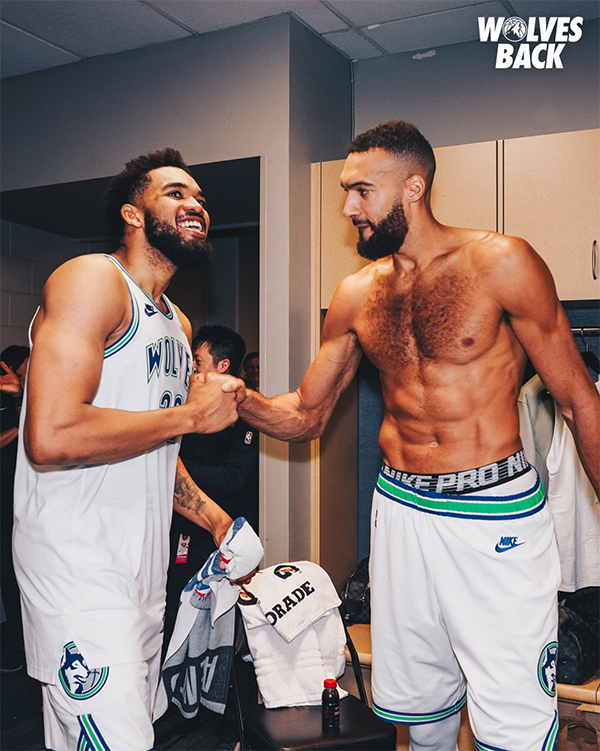 森林狼官方晒出众将疯狂庆祝的画面——在更衣室中,爱德华兹咧嘴大笑、冲着唐斯露发狠的霸气表情以及与助教一起怒吼庆祝;唐斯满脸笑容与戈贝尔握手;戈贝尔赤膊大秀腹肌,现场氛围犹如夺冠似的。