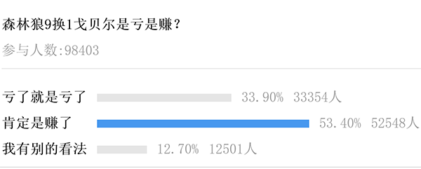 如今有媒体发起投票,称森林狼9换1得到戈贝尔,是赚还是亏?吸引了超过十万球迷们的投票,不同于此前的嘲讽,如今形势大反转,超半数的球迷认为森林狼赚大了,成绩就是硬道理。