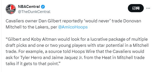 据报道,骑士队老板丹-吉尔伯特“绝不会”将多诺万-米切尔交易到湖人队 。