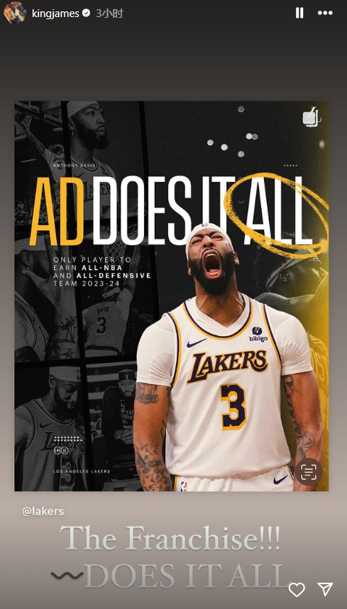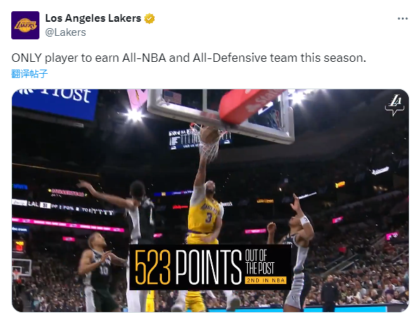 湖人恭贺浓眉入选双最佳 詹姆斯赞其为球队顶梁柱