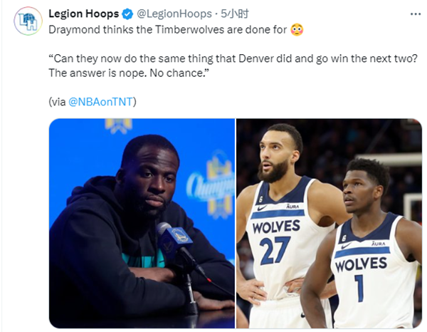 对于西决系列赛,勇士球星追梦格林认为森林狼已经完蛋了,表示:他们现在能像在丹佛那样赢得接下来的两场比赛吗?答案是不能,没有机会了。