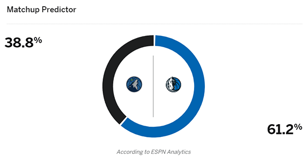 根据赛程,西决G3将在5月27日上午8点开打,ESPN预测本场比赛的胜率,独行侠61.2%,森林狼38.8,换言之,美媒看好独行侠主场3-0夺赛点。