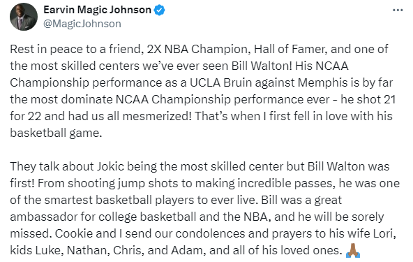 64岁魔术师约翰逊发推:愿我的朋友、两届 NBA 总冠军、名人堂成员、我们见过的最有技术性的中锋之一比尔-沃顿安息! 人们说约基奇是最有技巧的中锋,但比尔·沃顿才是第一!从跳投到做出令人难以置信的传球,他是有史以来最聪明的篮球运动员之一。比尔是大学篮球和 NBA 的伟大大使,我们会非常想念他的。我向他的妻子、孩子 以及他所有的亲人致以慰问和祈祷。