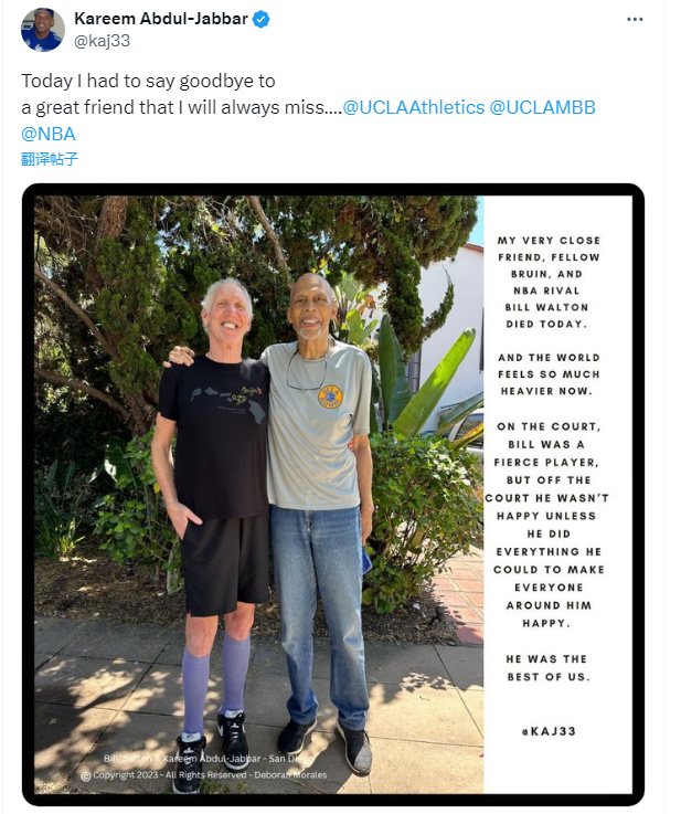 77岁的贾巴尔晒昔日与沃顿合影,写道:今天我不得不告别一位我将永远怀念的好朋友。