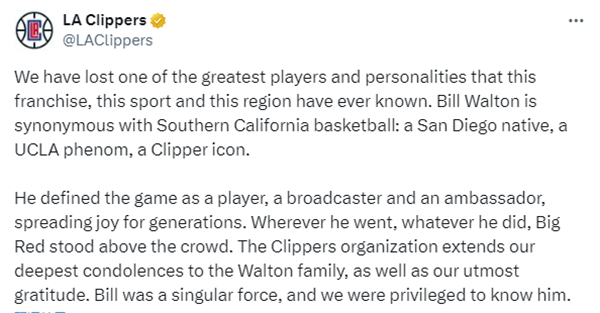 快船官方追悼,声明:我们失去了这支球队、这项运动和这个地区有史以来最伟大的球员和人物之一。比尔-沃顿是南加州篮球的代名词:圣地亚哥人、加州大学洛杉矶分校天才球员、快船队偶像。 他是一名球员、一名播音员和一名大使,为几代人传播欢乐。无论他去哪里,无论他做什么,他都站在人群之上。快船队向沃顿家族致以最深切的哀悼。比尔-沃顿是一股独特的力量,我们很荣幸认识他。