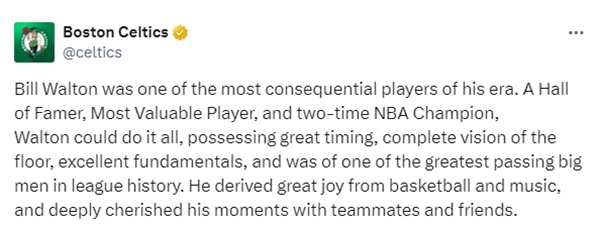 凯尔特人官方追悼:比尔-沃顿是他那个时代最有影响力的球员之一。作为名人堂成员、最有价值球员和两届 NBA总冠军,沃顿可以做到一切,他拥有极佳的时机把握能力、完整的场上视野、出色的基本功,并且是联盟历史上最伟大的传球大个子之一。他从篮球和音乐中获得了极大的乐趣,并非常珍惜与队友和朋友在一起的时光。