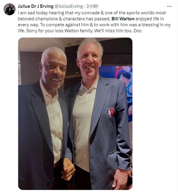 74岁“J博士”朱丽叶斯-欧文发推写道:今天我很难过地得知我的战友、体育界最受爱戴的冠军和人物之一去世了。比尔-沃顿在各方面都享受生活。与他竞争和与他共事是我一生的幸事。对沃顿一家的损失深表遗憾。我们也会想念他的。