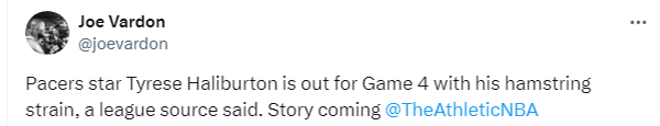 来源:360直播05-28 08:49360直播讯 北京时间5月28日,东决G4开打之前,名记woj报道哈利伯顿大概率缺席,之后据NBA记者Joe Vardon报道,步行者球星泰瑞斯-哈利伯顿因腿筋拉伤将缺席东决第四场比赛。