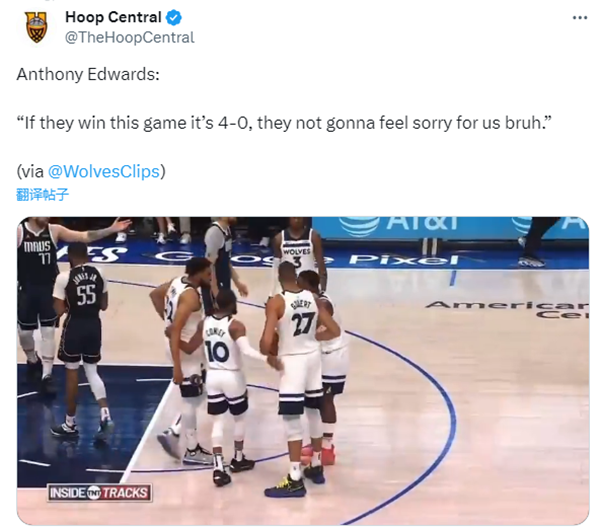 西决G4比赛期间,东契奇和欧文在场上喊队友开会,克莱伯反应太慢令东欧十分无奈;森林狼领袖爱德华兹也喊队友开过小会,强调保护篮板;坐在替补席,爱德华兹训话:如果他们以4-0赢得这轮系列赛,他们不会为我们感到难过。