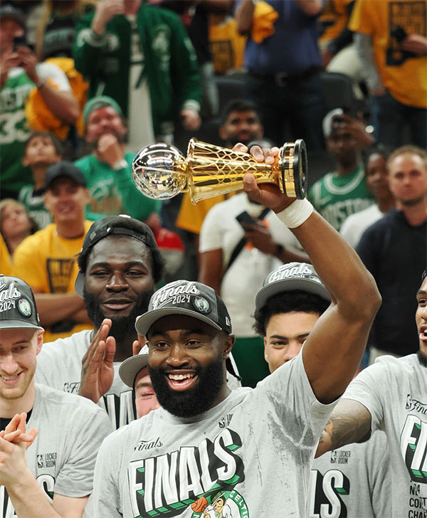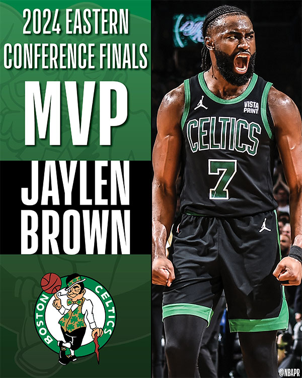 在颁奖仪式上,凯尔特人老板率先捧起东部冠军奖杯,之后杰伦-布朗荣获东决MVP,布朗咧嘴大笑以及高举奖杯庆祝,塔图姆等人都为他欢呼;在东决MVP投票结果中,布朗获得5票,塔图姆4票,布朗1票险胜夺得东决MVP。