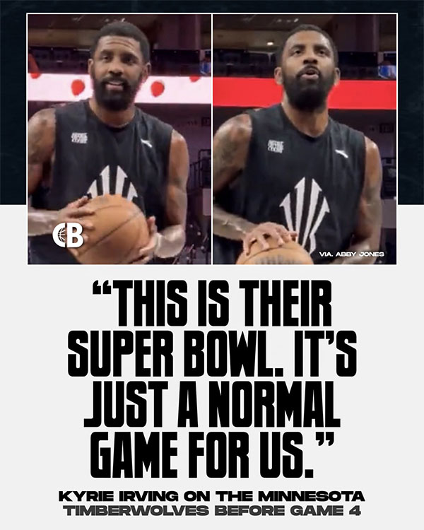 G4开打前,独行侠3-0领先森林狼,对于晋级之战,欧文在训练时表示:这对他们(森林狼)而言是超级碗,对我们来说就是一场普通比赛!