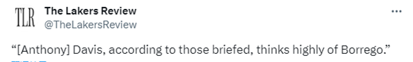 据悉,浓眉对博雷戈的评价很高,湖人还会与更多的候选人进行会面,距离湖人做出最后决定还为时尚早。