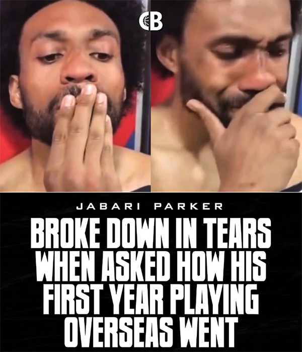 在更衣室中接受采访,贾巴里-帕克赤膊坐在更衣柜前,被问到在海外联赛打球第一年的情况时,帕克的情绪突然失控,伤心地擦拭眼泪,哽咽到无法说话,现场记者问帕克后只能取消这一次采访。