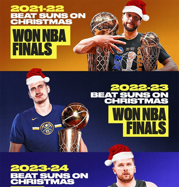 球迷们力挺独行侠夺冠,甚至还有用玄学来回应的,称最近两个赛季的NBA总冠军,都是在年终大战击败了太阳,前年的勇士,去年的掘金,都是在年终大战击败太阳,然后获得当赛季的NBA总冠军。如今本赛季,独行侠在年终大战击败太阳,夺冠的可能性自然是更大,很显然拥有杜兰特、布克和比尔的太阳躺枪了。