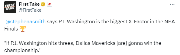 对于今年总决赛,名嘴A-史密斯表示PJ-华盛顿是最大X因素:如果 PJ-华盛顿能投中三分球,最终达拉斯独行侠将赢得总冠军。