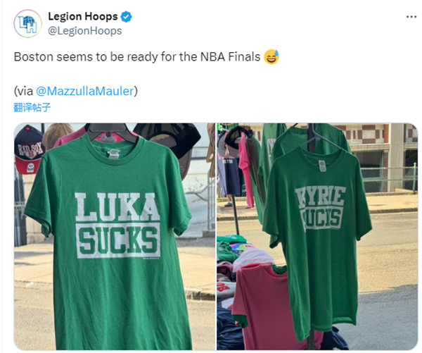 目前独行侠和凯尔特人都在积极备战总决赛G1,两队将在三天后打响争冠首战,地点是波士顿TD北岸花园球馆;据美媒报道,波士顿商店已经开始售卖印有“东契奇垃圾”“欧文垃圾”的绿色T恤。