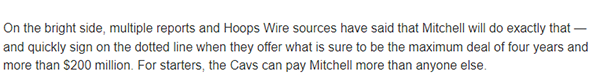 Sam Amico则报道称,如果骑士提供一份4年超过2亿的顶薪合同,多诺万-米切尔会迅速签下这一份续约合同;今夏骑士可以给米切尔提供比其他任何队更多的薪资,他们可以在7月份开出报价,米切尔可以接受。