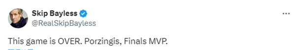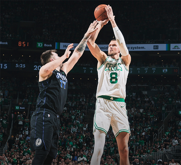 波尔津吉斯首节上场7分钟,5中4独砍11分3篮板2盖帽,大帽欧文太狠,攻防一体,一人得分等于东欧两人总和;名嘴Skip直言:这场比赛结束了,波尔津吉斯总决赛MVP;东欧第一节12中5拿到11分;而且绿军全队第一节命中7记三分球,早早拉开分差。
