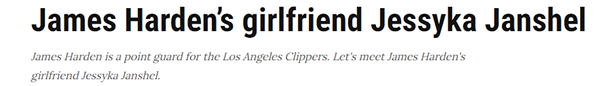 杰西卡-简舍尔于1991年在得克萨斯州出生和长大,现年32岁,比哈登小2岁,身高1米68,在大学中途退学开启模特生涯并且进入娱乐圈,2015年,她出现在众多杂志和音乐视频中,也参加了一些活动,尤其是作为 NFL 球员 Josh Huff 活动的主持人。