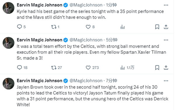 湖人名宿魔术师发推写道:杰伦-布朗下半场24分接管了比赛,带领凯尔特人取得胜利,塔图姆终于打出了31分的表现,但凯尔特人的无名英雄是德里克-怀特。这是绿军全队一起的努力,所有角色球员都表现出色,就连蒂尔曼也投进三分球。