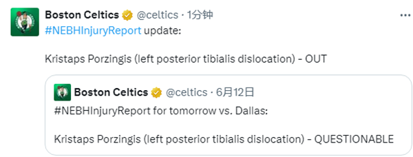 来源:360直播06-13 10:44360直播讯 北京时间6月13日,NBA总决赛G3一触即发,凯尔特人官宣坏消息,波尔津吉斯因左胫骨后脱位而缺席第三场,东契奇继续带伤出战。