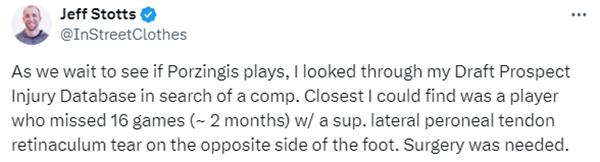 波津遭遇的伤病十分罕见,医学专家Jeff Stotts表示他找遍了伤病数据库,才找到与波津伤病类似的一个病例,这名球员(阿多尼斯-托马斯)因腓骨外侧肌腱支撑带撕裂而缺席了 16 场比赛(约 2 个月),需要进行手术。