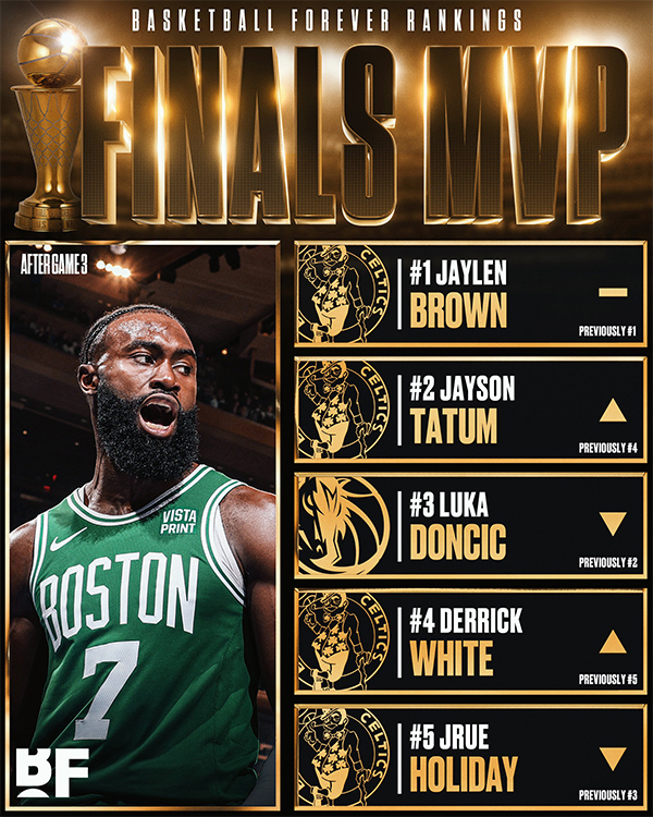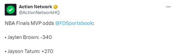 G3赛后,博彩网站更新了总决赛MVP的赔率:杰伦-布朗 -340,塔图姆 +270,布朗大幅领先成为FMVP最大热门;勇士记者马库斯-汤普森二世点评表示:我认为这场比赛让杰伦-布朗提前锁定了FMVP,退一步讲至少是锁了领跑者的位置。