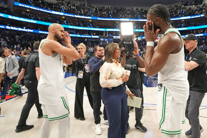 G3赢球后布朗和塔图姆在独行侠主场logo处拥抱庆祝,布朗还与怀特一起做出“晚安”的庆祝动作;他们距离夺得总冠军,只差一场胜利,最快将在本周六加冕总冠军。
