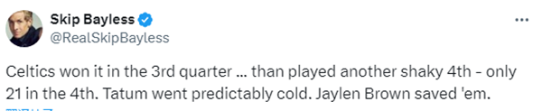G3赛点战,布朗全场拿到30分8篮板8助攻,下半场独砍24分,末节关键时刻挺身而出;对于布朗的表现,名嘴Skip更推道:凯尔特人在第三节赢了。然后他们又打了一个摇摇欲坠的第四节——只得到21分。塔图姆不出所料地变铁了(末节5中1得到4分),杰伦-布朗拯救了他们。