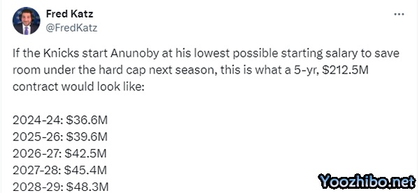 阿努诺比2.125亿美元合同细节曝光——24-25赛季3660万美元,25-26赛季3960万美元,26-27赛季4250万美元,27-28赛季4540万美元和28-29赛季4830万美元。