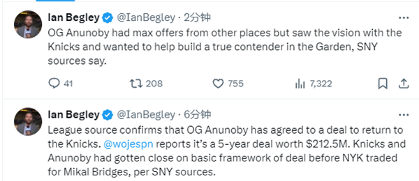 Ian Begley还透露,阿努诺比曾收到过其他球队的顶薪报价,但他看中了尼克斯队的愿景,并希望帮助尼克斯打造一支真正的劲敌球队。