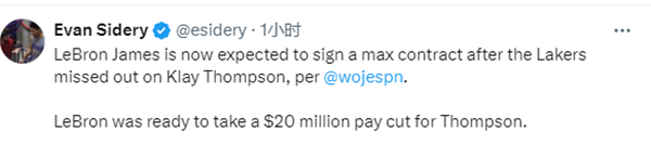 名记Woj透露,在湖人错失签下克莱的机会后,詹姆斯预计会与湖人签下一份顶薪合同,双方预计续签3年1.62亿美元大合同。